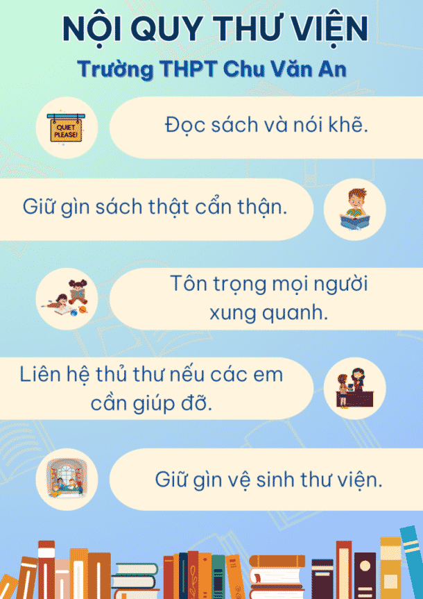 Thư viện là nơi kết nối quá khứ và hiện tại, truyền cảm hứng nghiên cứu và phát triển năng lực tiềm ẩn. Với sứ mệnh phục vụ văn hóa đọc, thư viện tạo ra không gian tri thức đầy tích cực. Hãy tuân thủ Nội quy Thư viện để đảm bảo sự sắp xếp và an ninh tốt nhất các em nhé!
